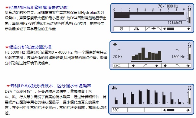 HL5000-2专业型数字听漏仪采用DSA噪声自动识别技术,具有出色的听音性能,通过实时显示的最小噪声测量值、噪声剖面图、频谱分析、漏点连续监听等功能视听漏点主要用于供水管网漏水路面听音普查与精确定位。主机体积小,重量轻,携带方便,大屏幕显示(带背景光)清晰显示测试结果,操作简单,让漏点定位工作更简单、轻松!具有独立的信号放大器与耳机放大器,提供高品质的声音保真质量,有效查找微小漏点。
