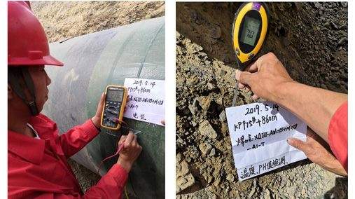 电火花检漏检测:按照标准要求,根据不同防腐层标准的厚度要求,计算检漏电压为15kV,采用电火花检漏仪进行检测,记录漏点数及漏点分布情况、裂纹、剥离等现象。